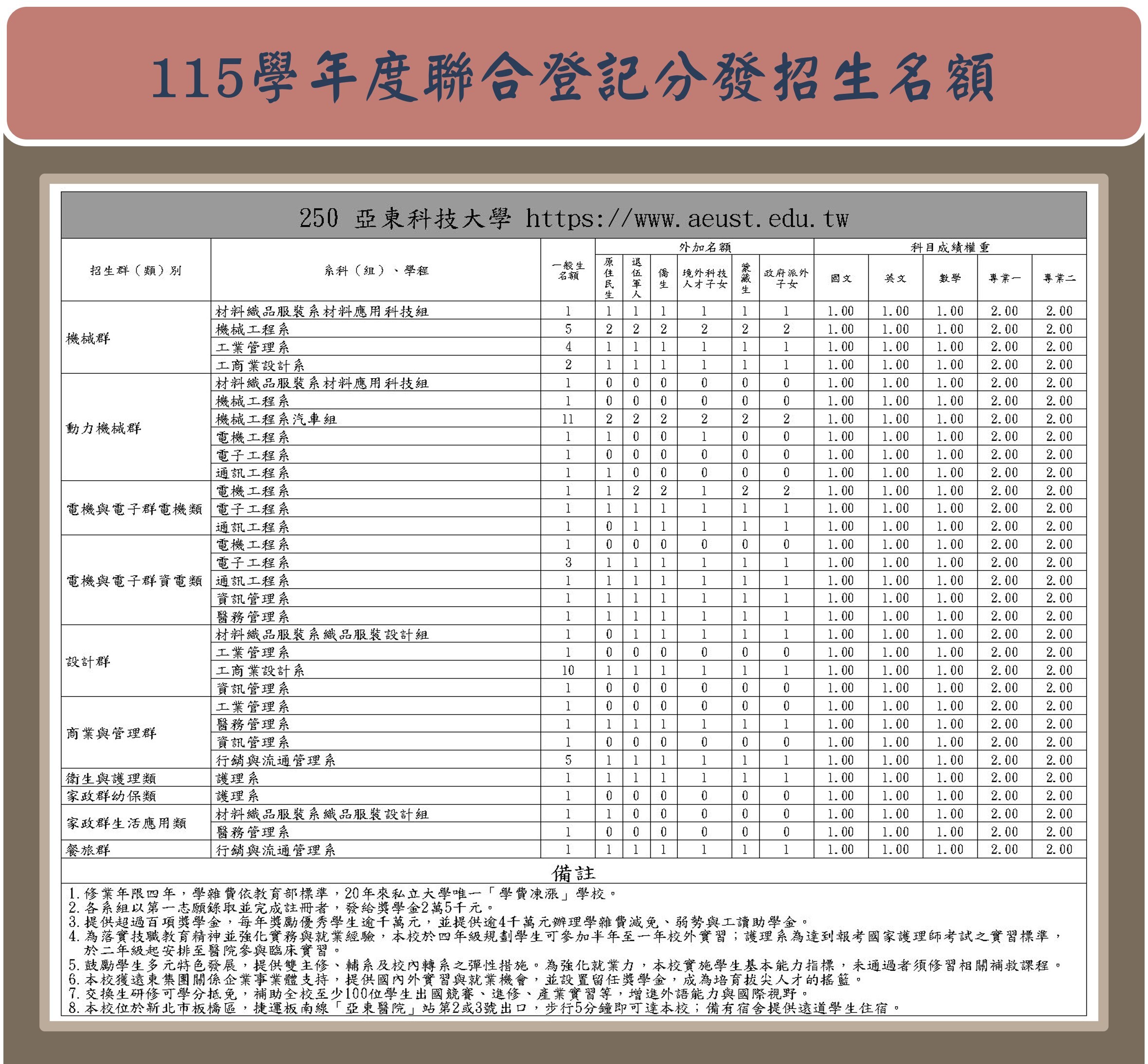 亞東科技大學115學年度四技聯合登記分發招生公告